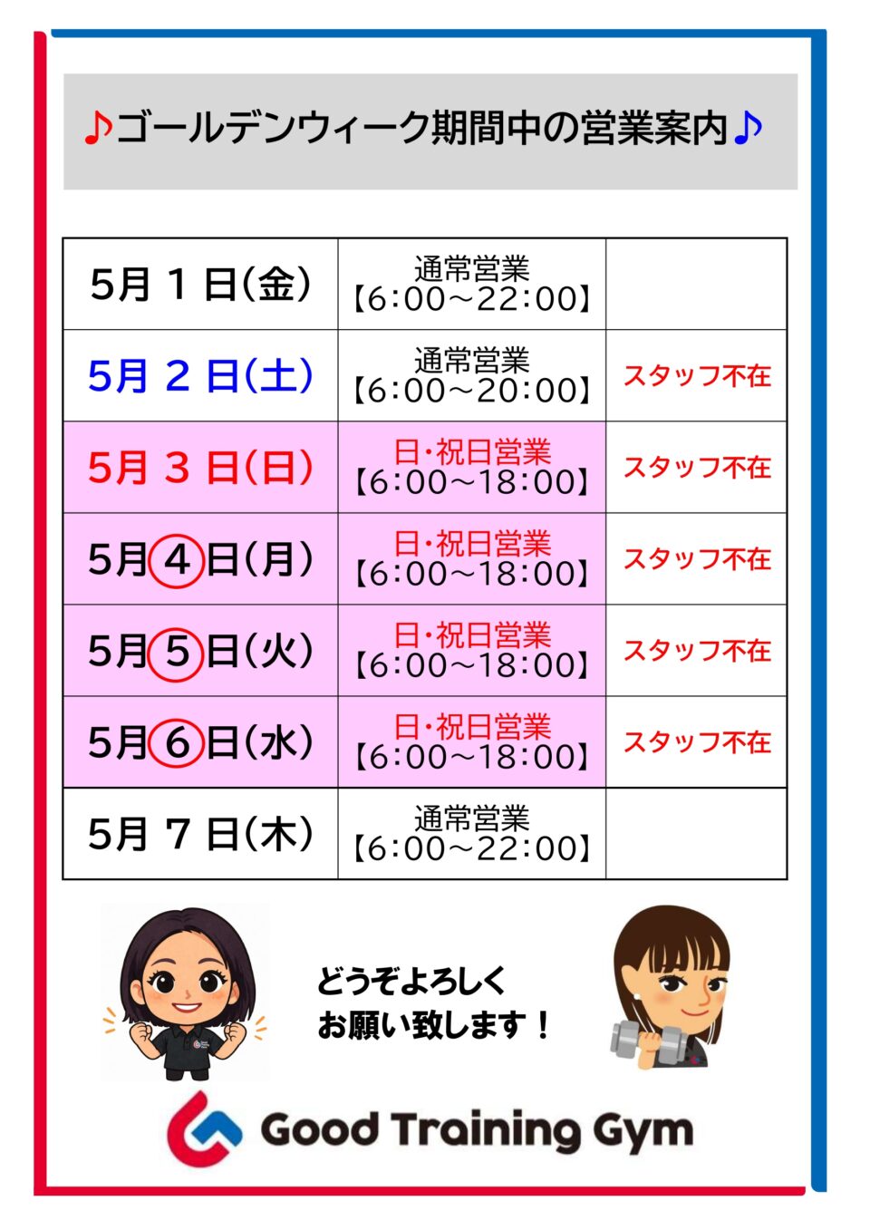 ♪ゴールデンウィーク期間中の営業案内♪ 2026.04.23 お知らせ スタッフ不在の場合は、ご入会手続き、無料体験、ビジターの対応が出来ません。 どうぞご了承の程、お願い申し上げます。 この記事をシェア ツイート シェア 送る