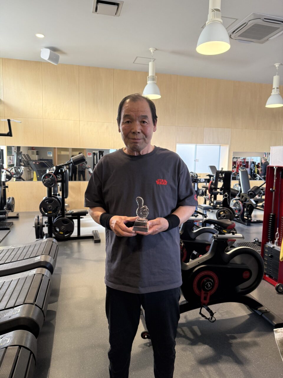 そしてもうお一人、同じく70代の会員様。こちらの方はなんと週6回、ほぼ毎日ジムに通われています。運動が生活の一部になっていることが伝わってきます。トロフィーも喜んでもらいこちらまで嬉しくなりました。